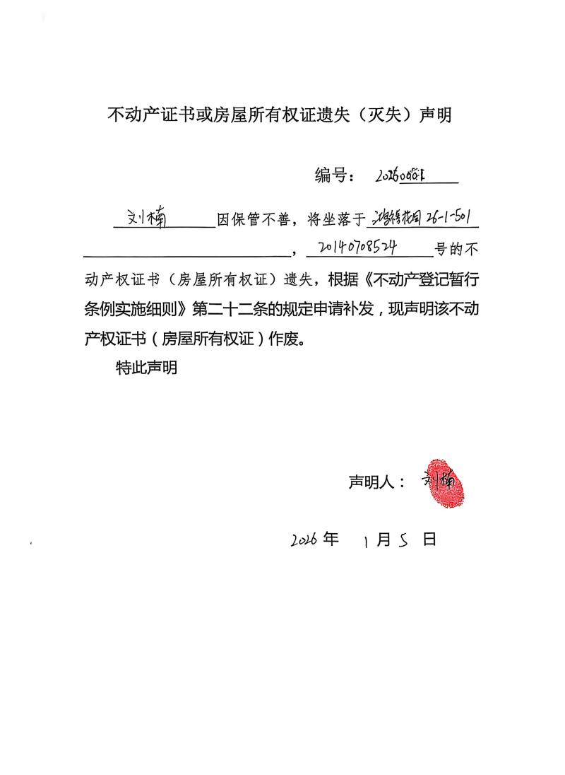 劉楠不動產證書或房屋所有權證遺(滅失)失聲明,編號:20260001