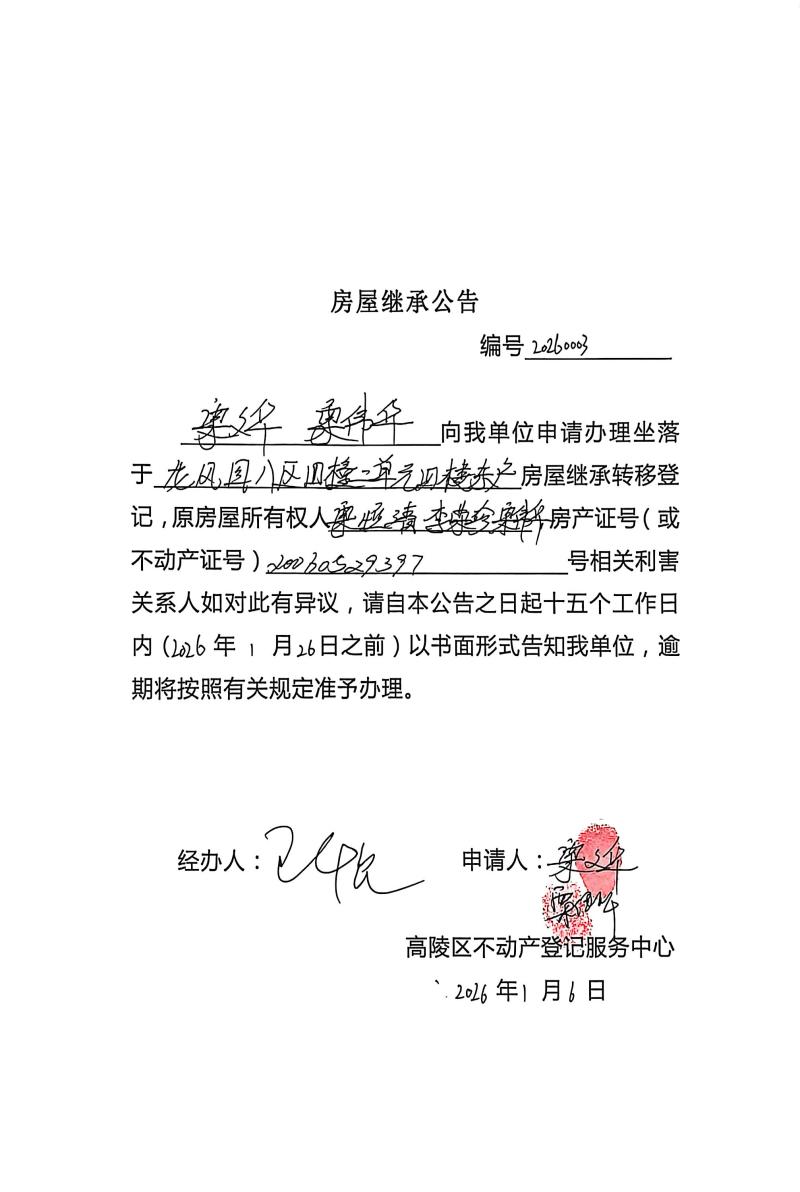 栗文華、栗偉華房屋轉移登記公告,編號:20260003