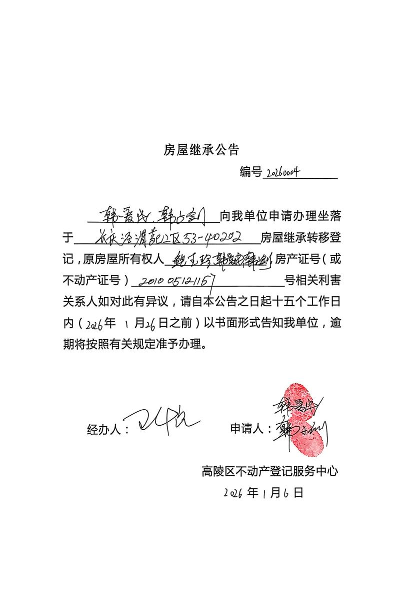 韓愛民、韓子劍房屋轉移登記公告,編號:20260004