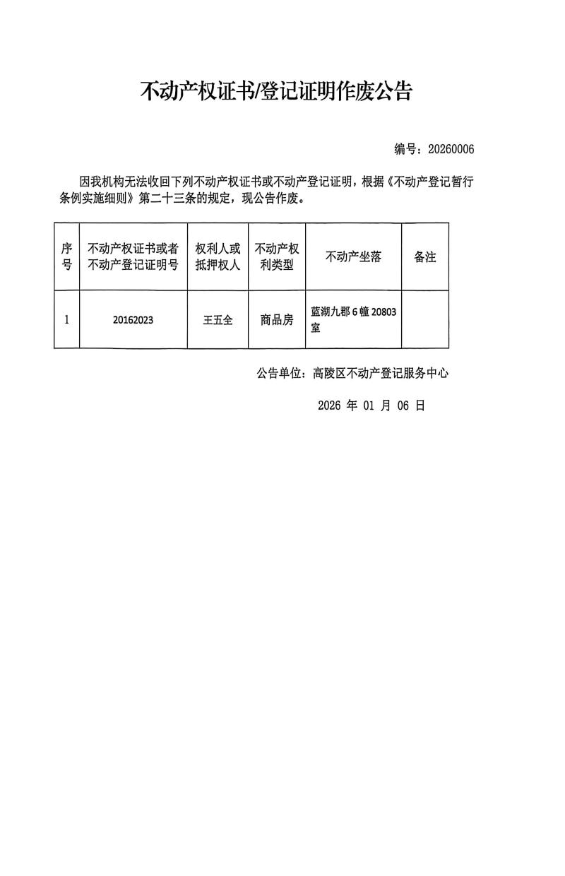 王五全不動產(chǎn)權(quán)證書/登記證明作廢公告,編號:20260006
