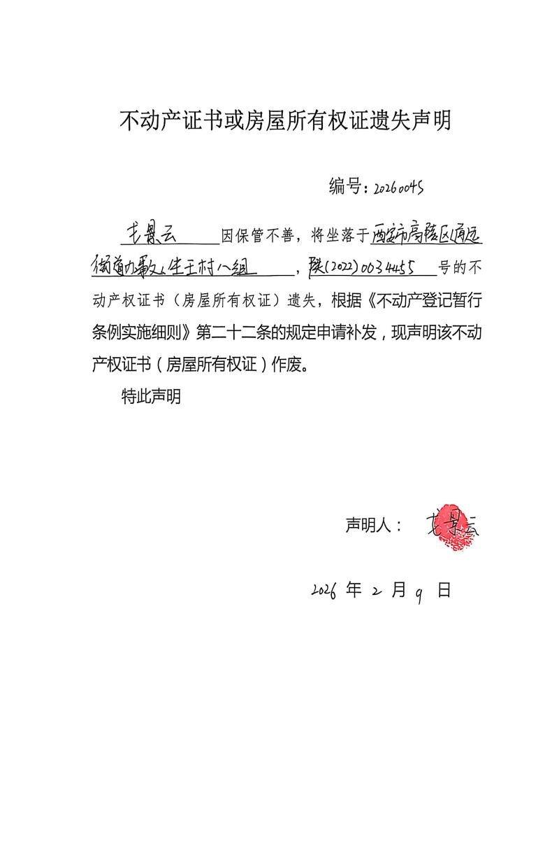戈景云不動產證書或房屋所有權證遺失聲明,編號:20260045