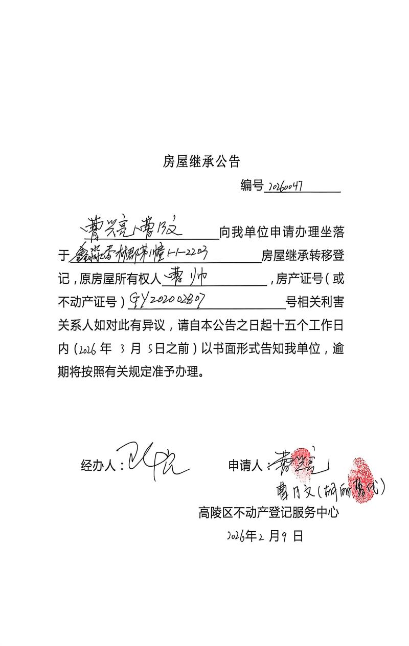 曹興良、曹乃文房屋繼承公告 編號:20260047