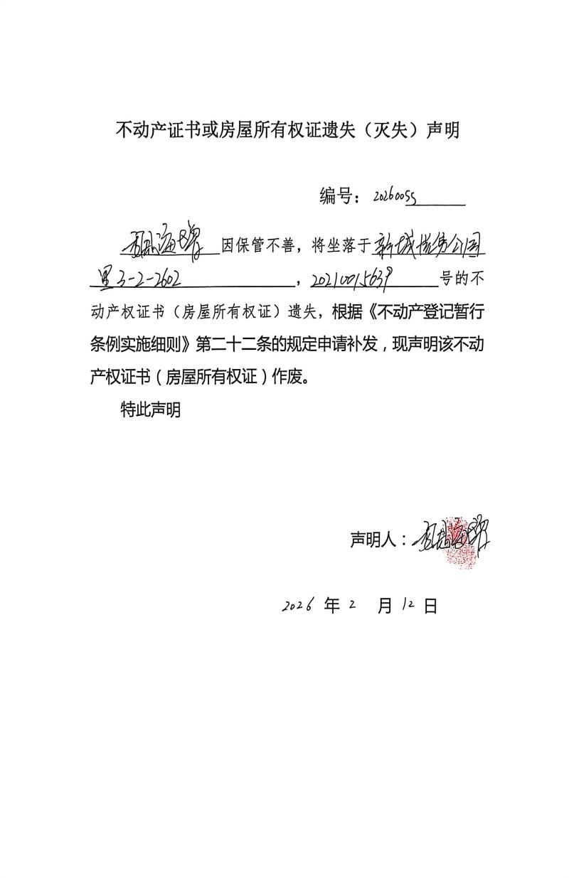 魏海增不動(dòng)產(chǎn)證書或房屋所有權(quán)證遺失(滅失)聲明,編號(hào):20260055
