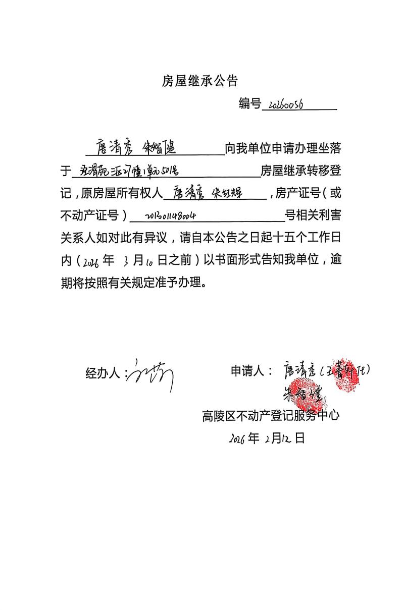 唐清秀、朱智健房屋繼承公告,編號:20260056