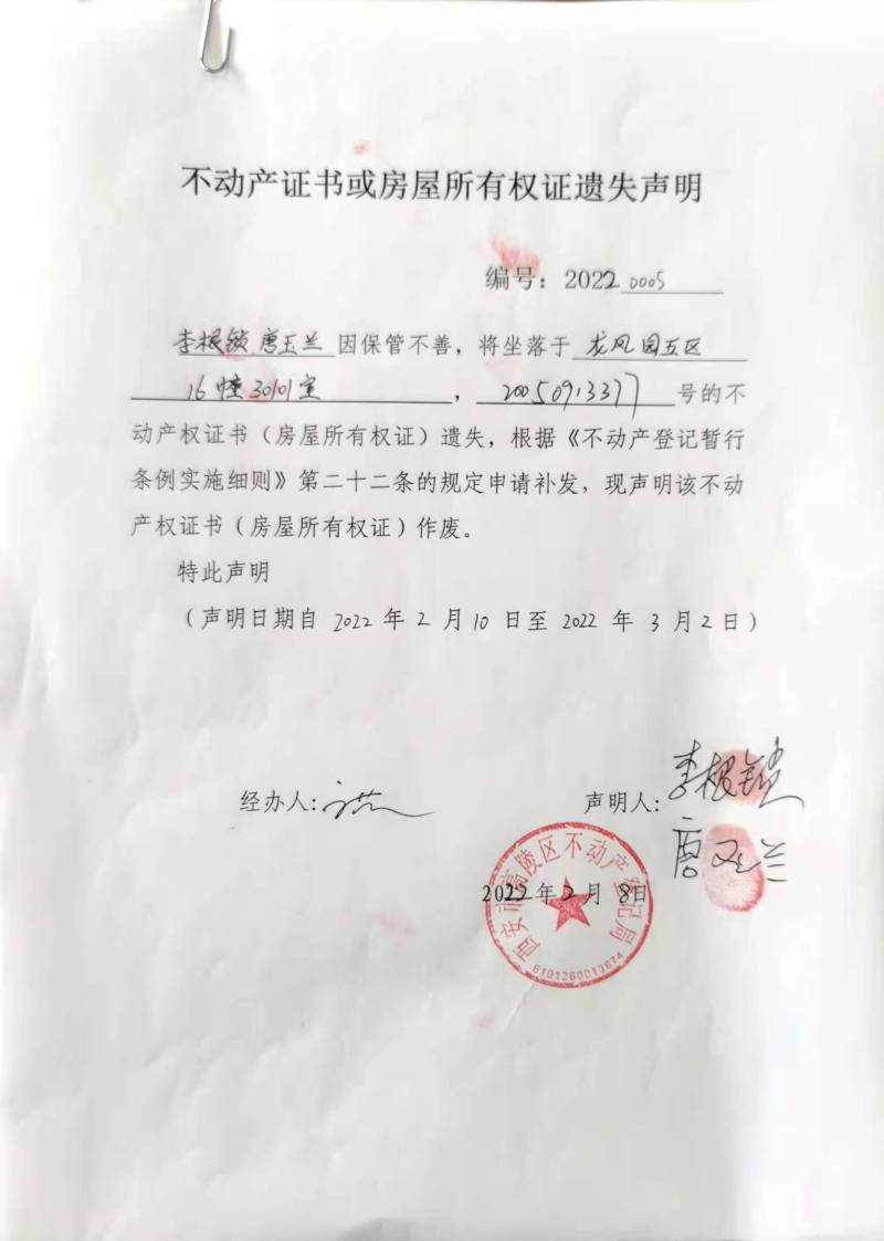李根鎖、唐玉蘭不動產證書或房屋所有權證遺失聲明 編號:20220005