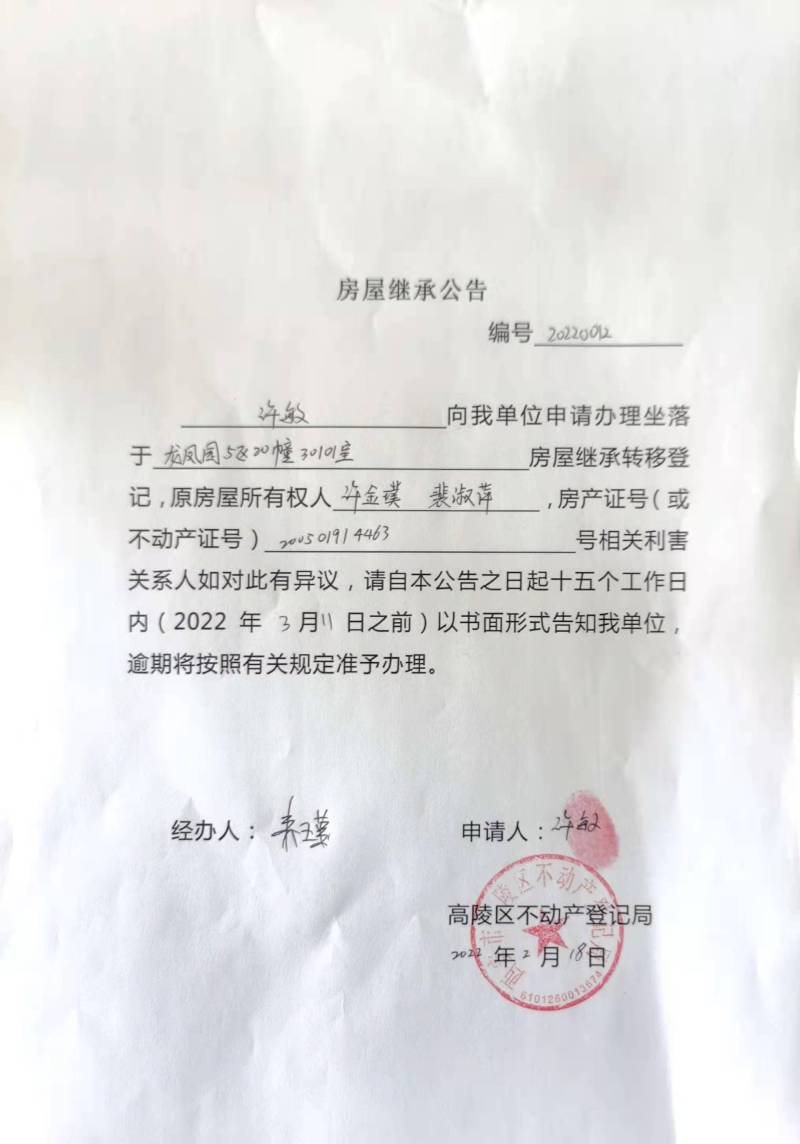 許敏房屋繼承公告編號:20220012