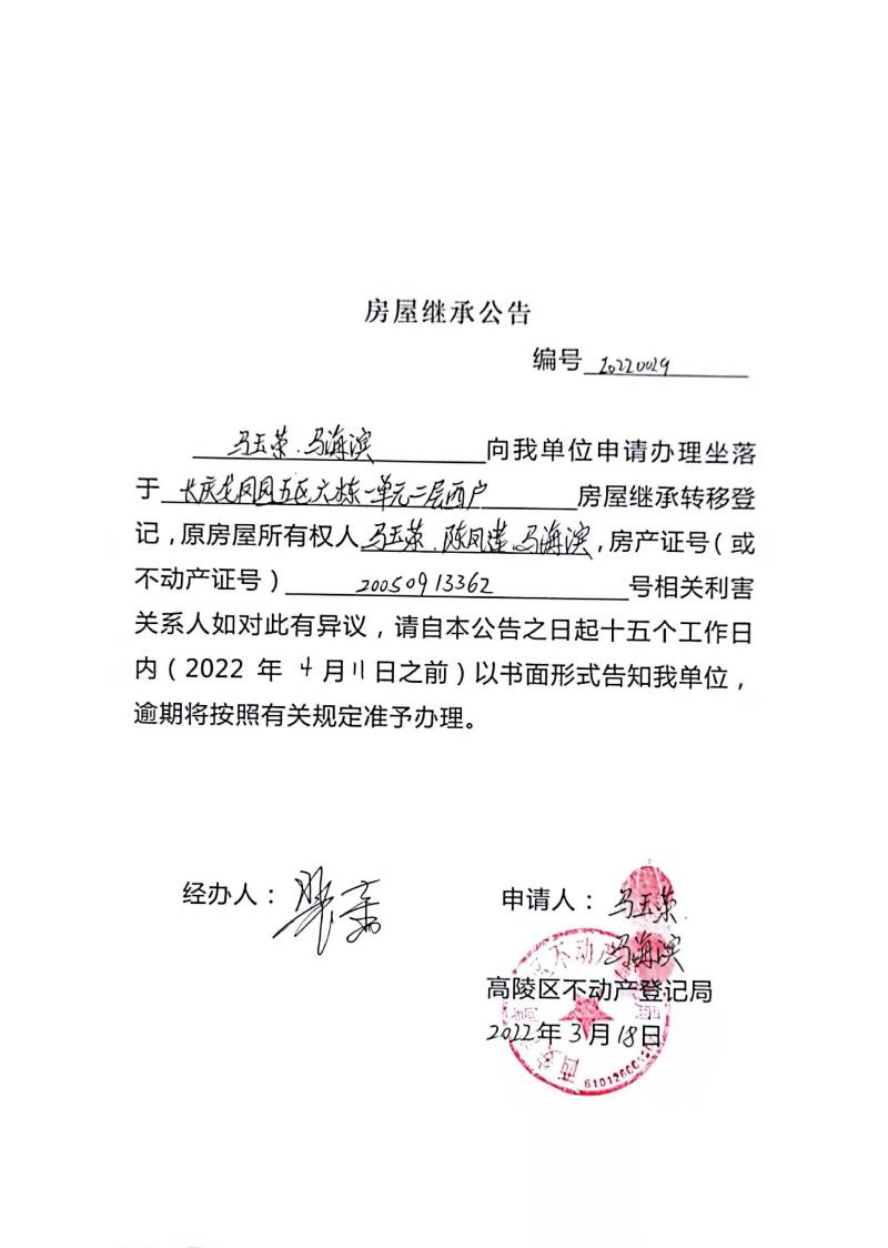 馬玉榮、馬海濱房屋繼承公告編號:20220029