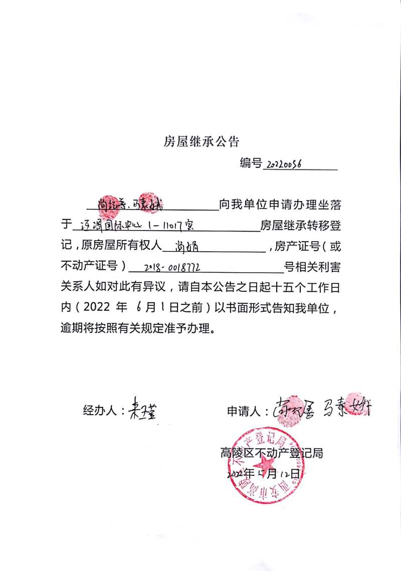尚紀善、馬素娥房屋繼承公告編號:20220056