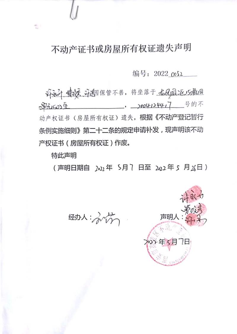 許永升、許濤、曹改秀不動產證書或房屋所有權證遺失聲明 編號:20220052