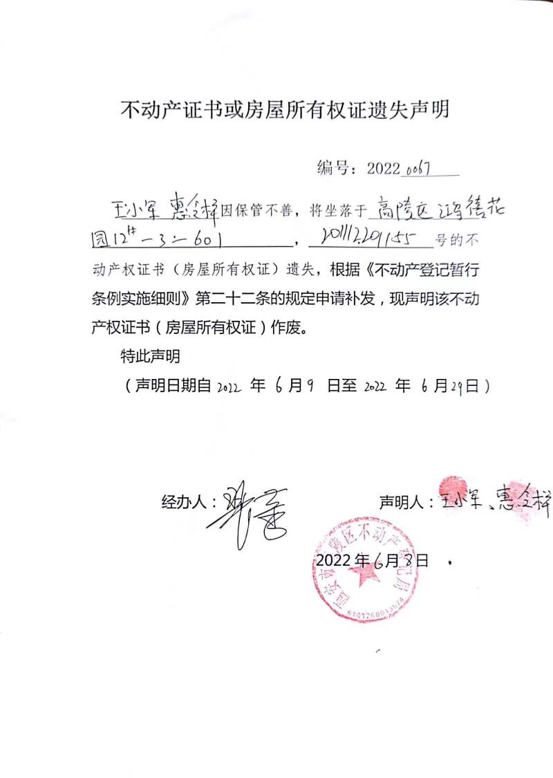 王小軍、惠令樣不動(dòng)產(chǎn)證書或房屋所有權(quán)證遺失聲明 編號(hào):20220067