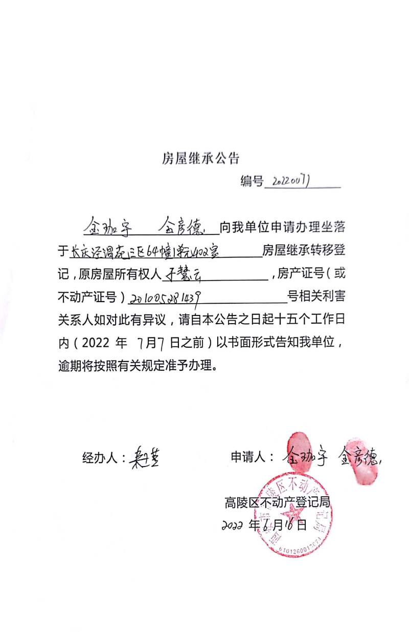 金珈宇、金彥德房屋繼承公告編號:20220071
