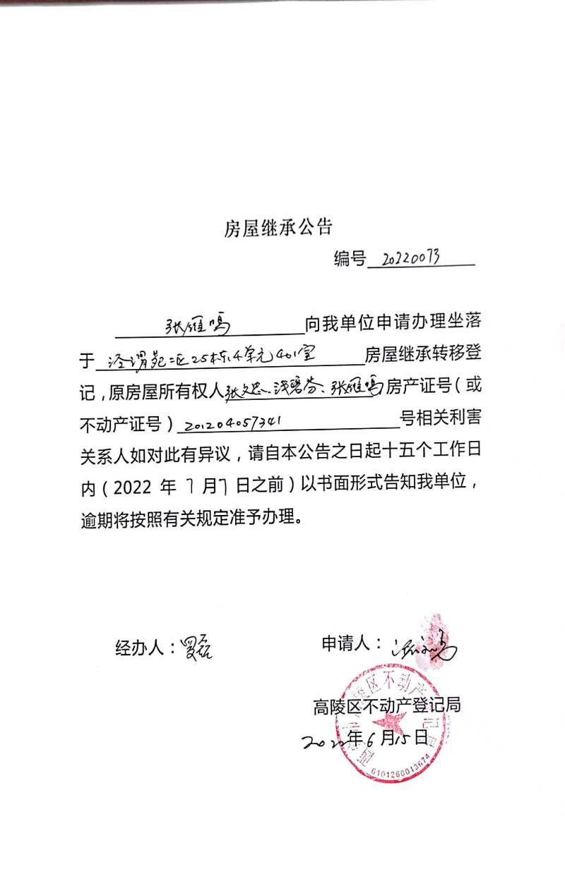 張雁鳴房屋繼承公告編號:20220073