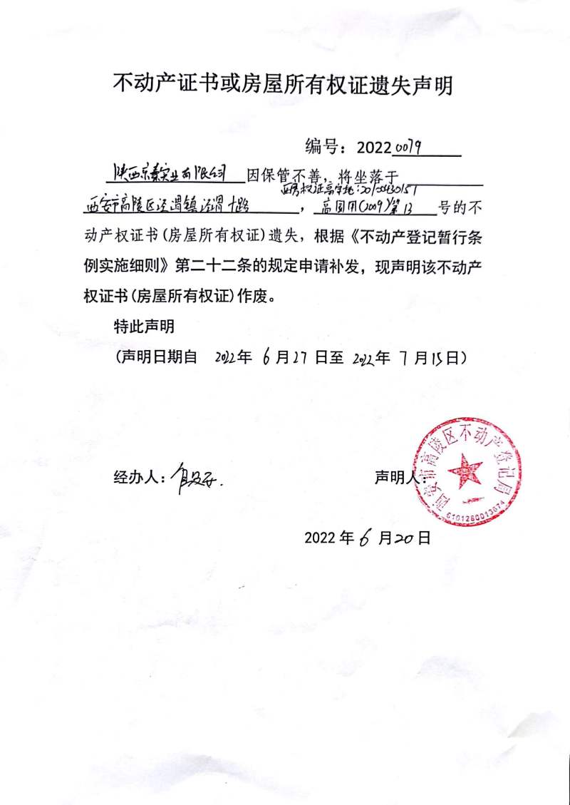 陜西京秦實業有限公司不動產證書或房屋所有權證遺失聲明 編號:20220079