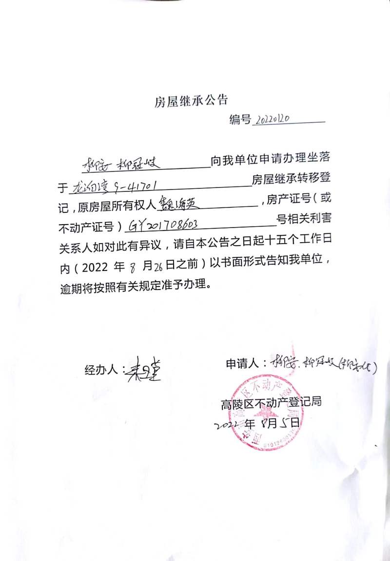 柳安、柳冠岐房屋繼承公告 編號:20220120
