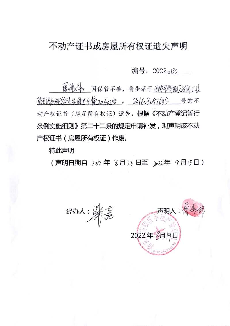 屠偉偉不動(dòng)產(chǎn)證書或房屋所有權(quán)證遺失聲明 編號(hào):20220133