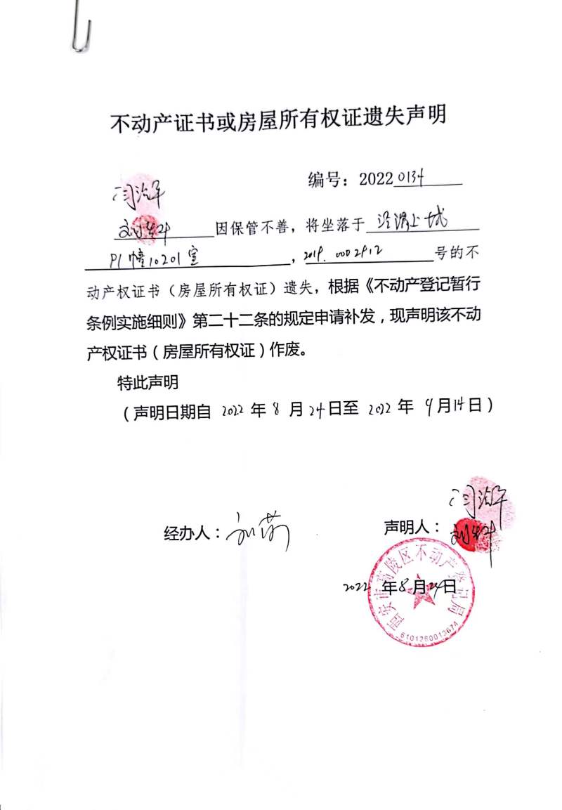 閆治平、劉先葉不動產證書或房屋所有權證遺失聲明 編號:20220134