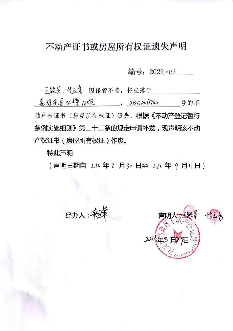 王鐵軍、付玉香不動產證書或房屋所有權證遺失聲明 編號:20220136