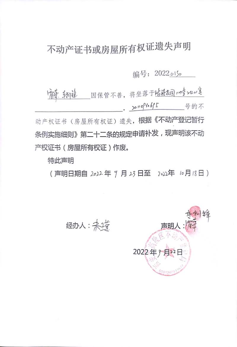 雷榮、車利鋒不動產證書或房屋所有權證遺失聲明 編號:20220150