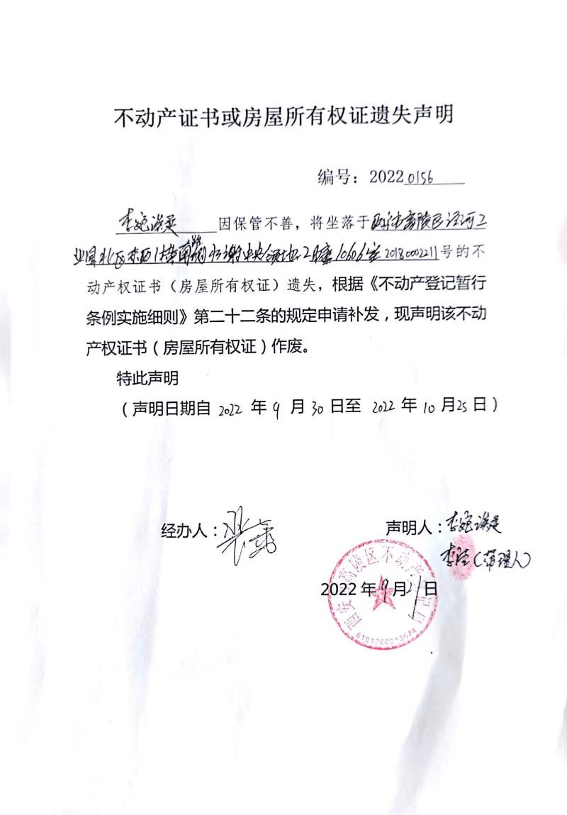 李宛凝不動產證書或房屋所有權證遺失聲明 編號:20220156