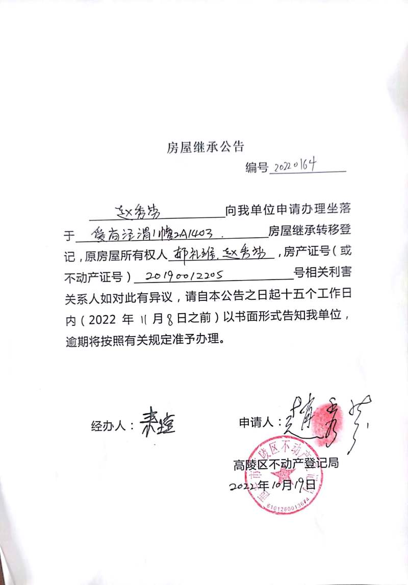 趙秀芳房屋繼承公告編號:20220164