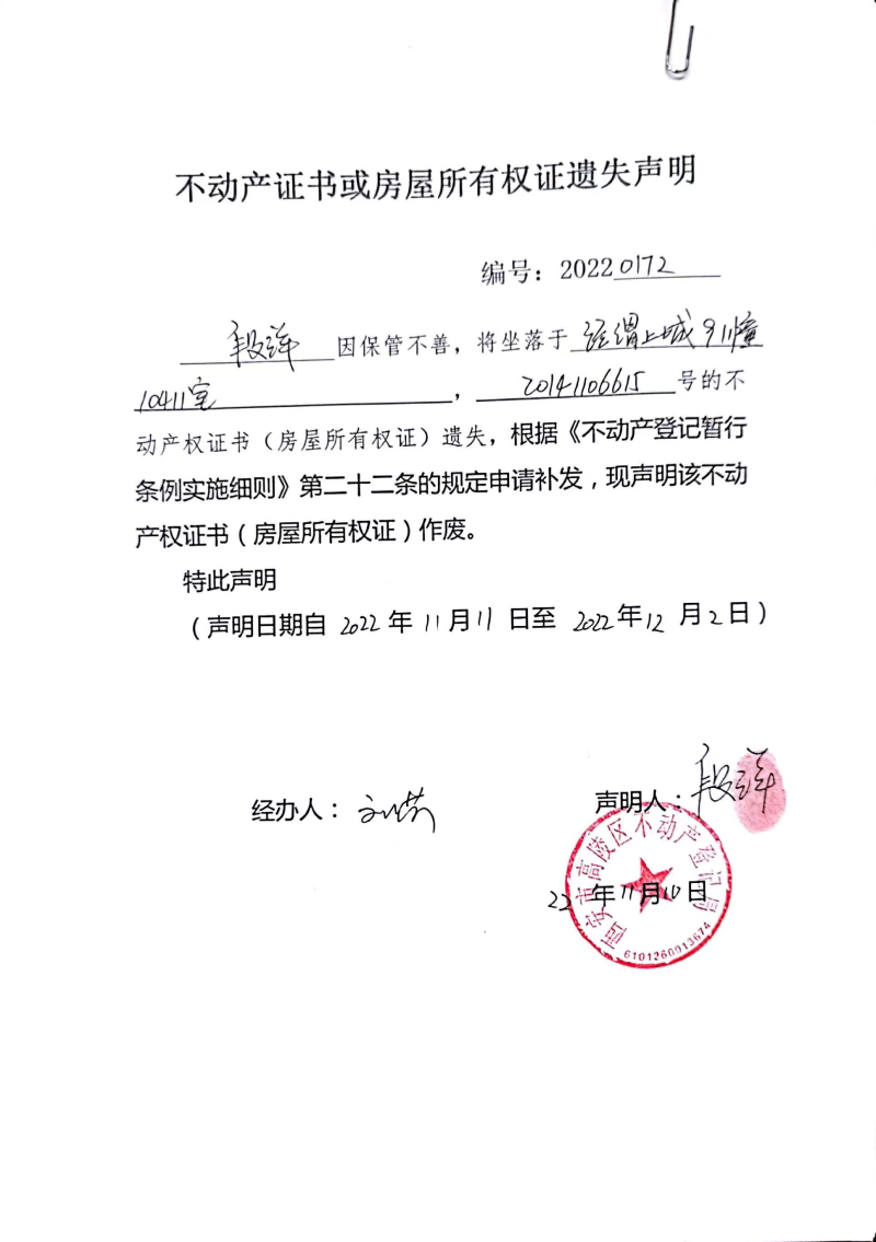 段洋 不動產證書或房屋所有權證遺失聲明 編號:20220172