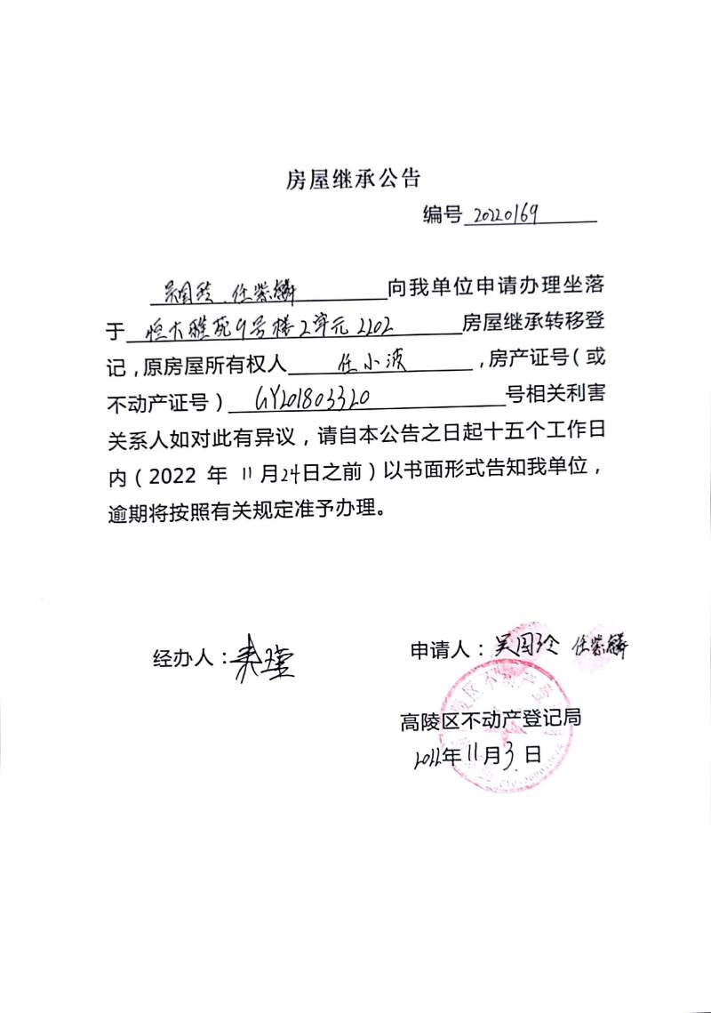吳國玲、任紫麟房屋繼承公告編號:20220169