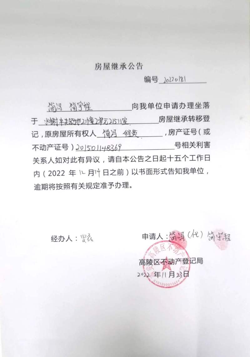 簡馮 簡宇程 房屋繼承公告 編號:20220181