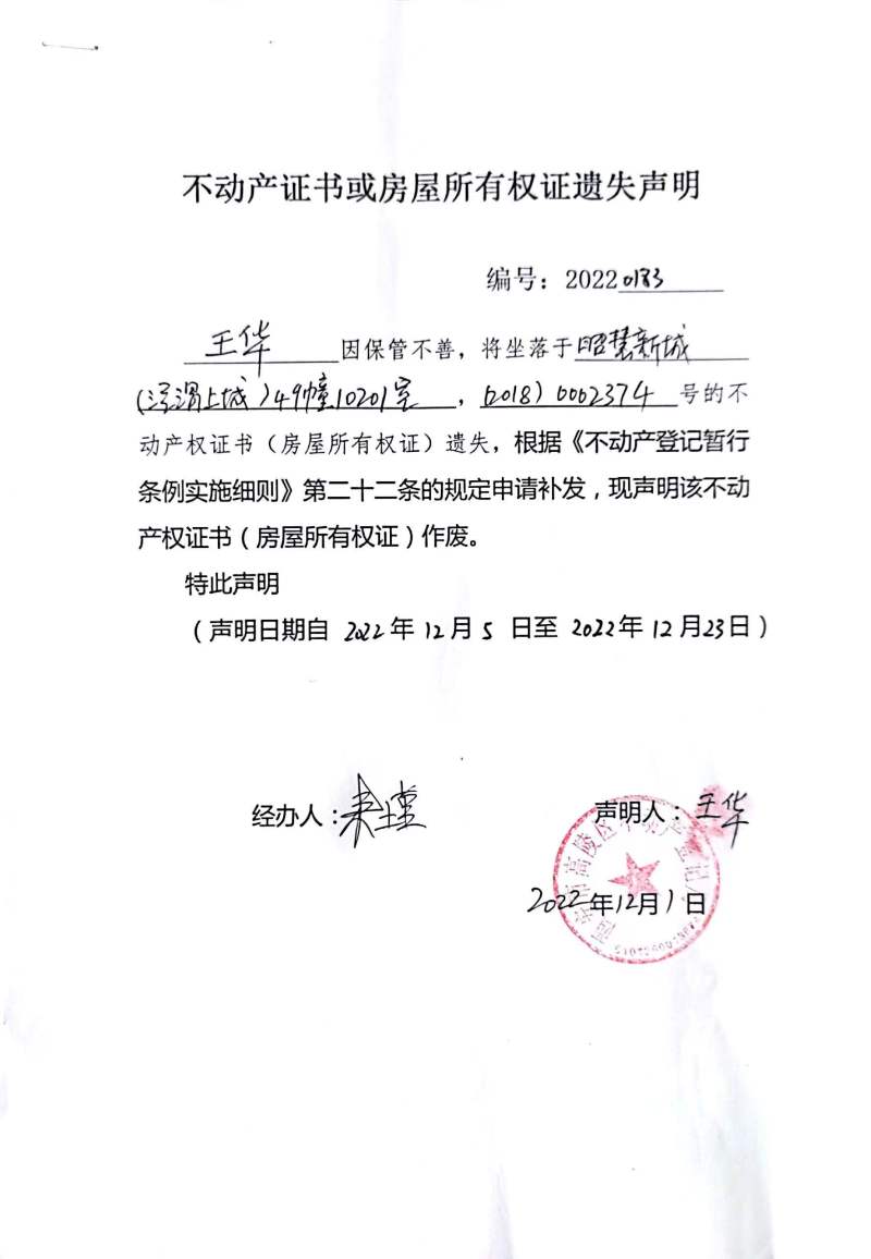 王華不動產證書或房屋所有權證遺失聲明 編號:20220183