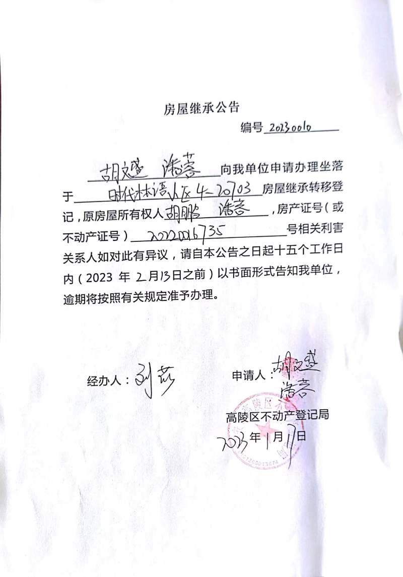 胡文盛、潘蓉房屋繼承公告編號:20230010