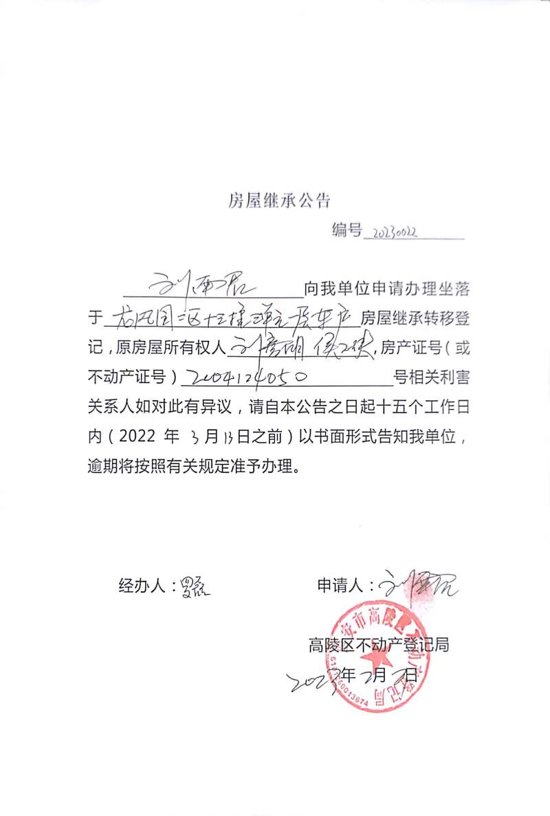 劉南君房屋繼承公告 編號:20230022
