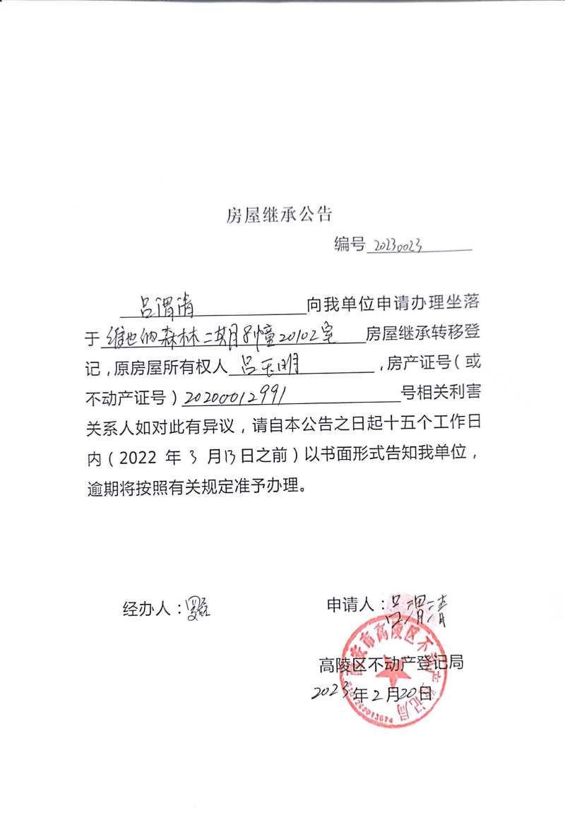呂渭清房屋繼承公告 編號:20230023