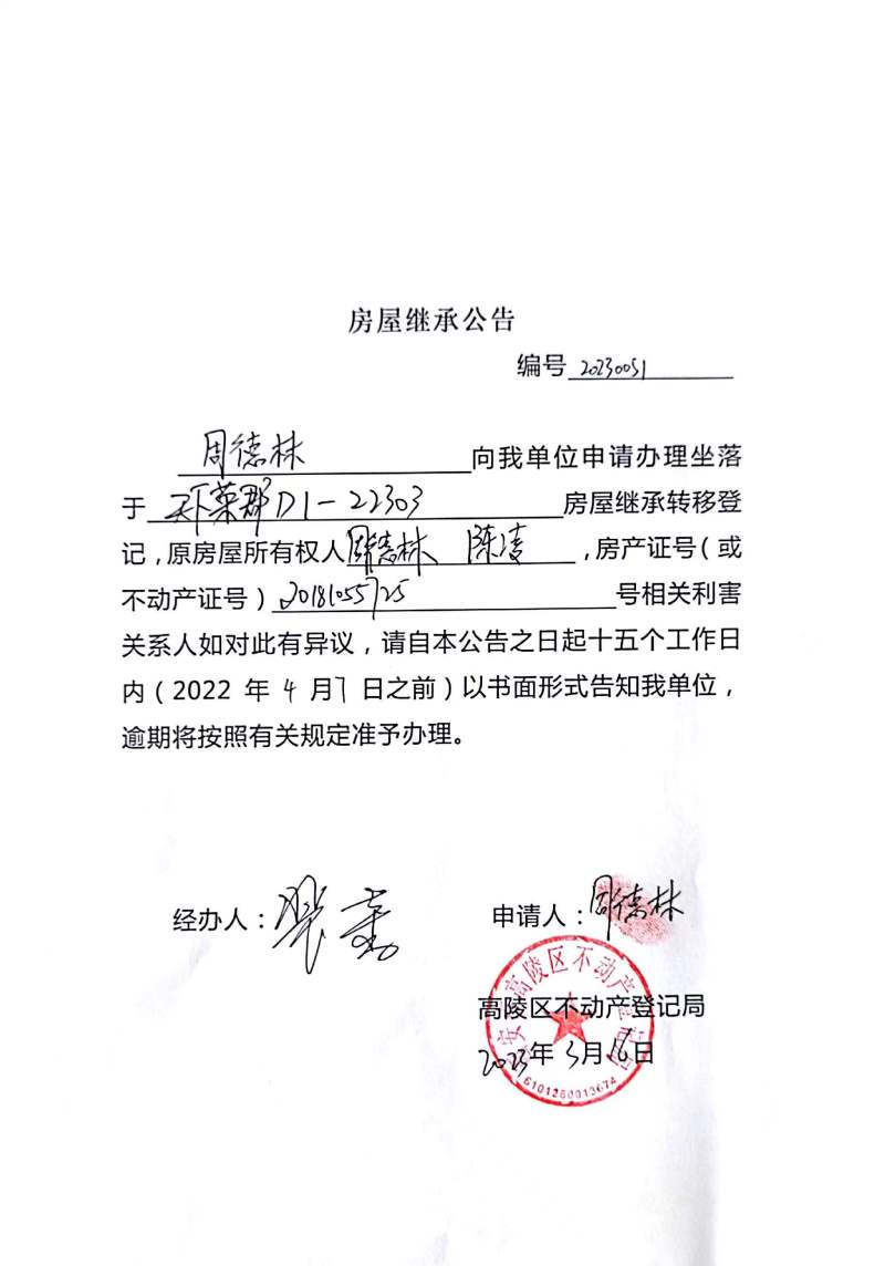周德林房屋繼承公告 編號:20230051