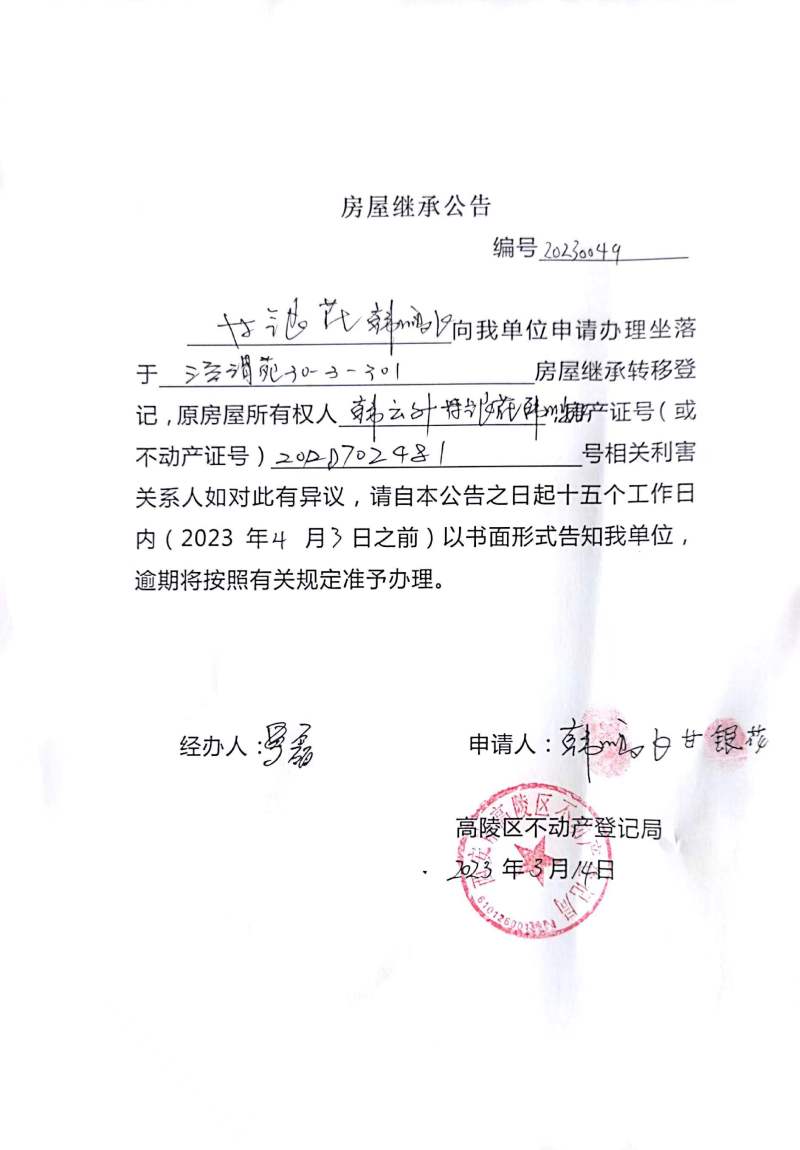 甘銀花、韓鵬飛房屋繼承公告 編號:20230049
