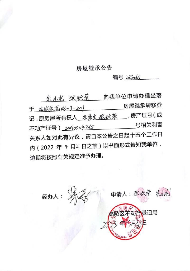 朱小龍、張秋榮房屋繼承公告 編號(hào):20230065