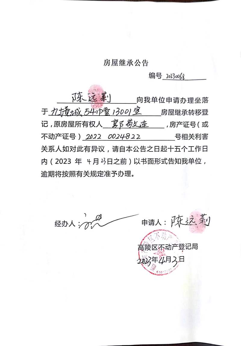 陳遠(yuǎn)莉房屋繼承公告 編號(hào):20230068