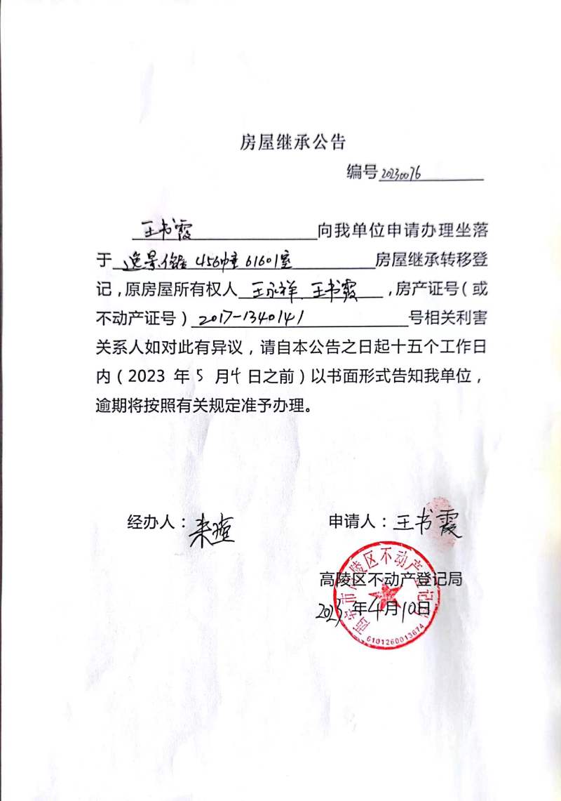 王書霞房屋繼承公告 編號:20230076
