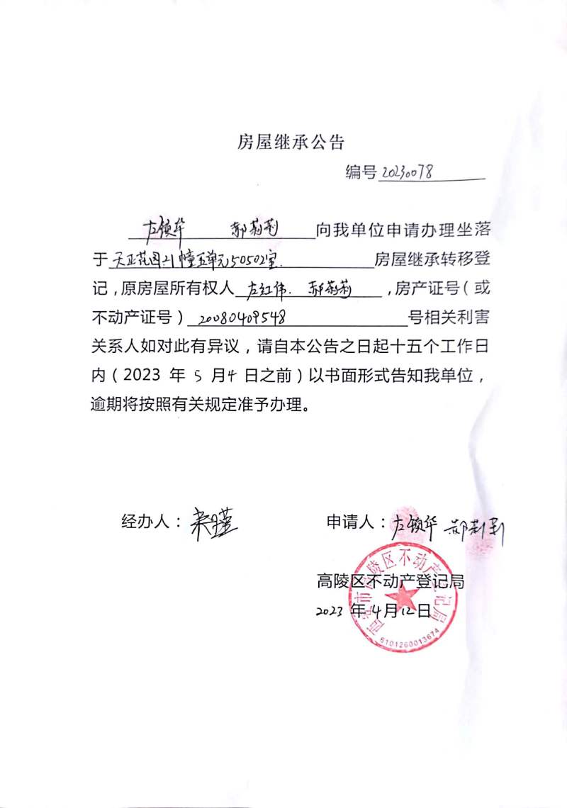 左鎮華郝莉莉房屋繼承公告 編號:20230078