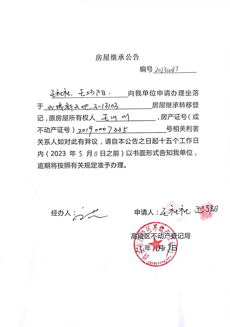 王社社、王巧陽房屋繼承公告 編號:20230087