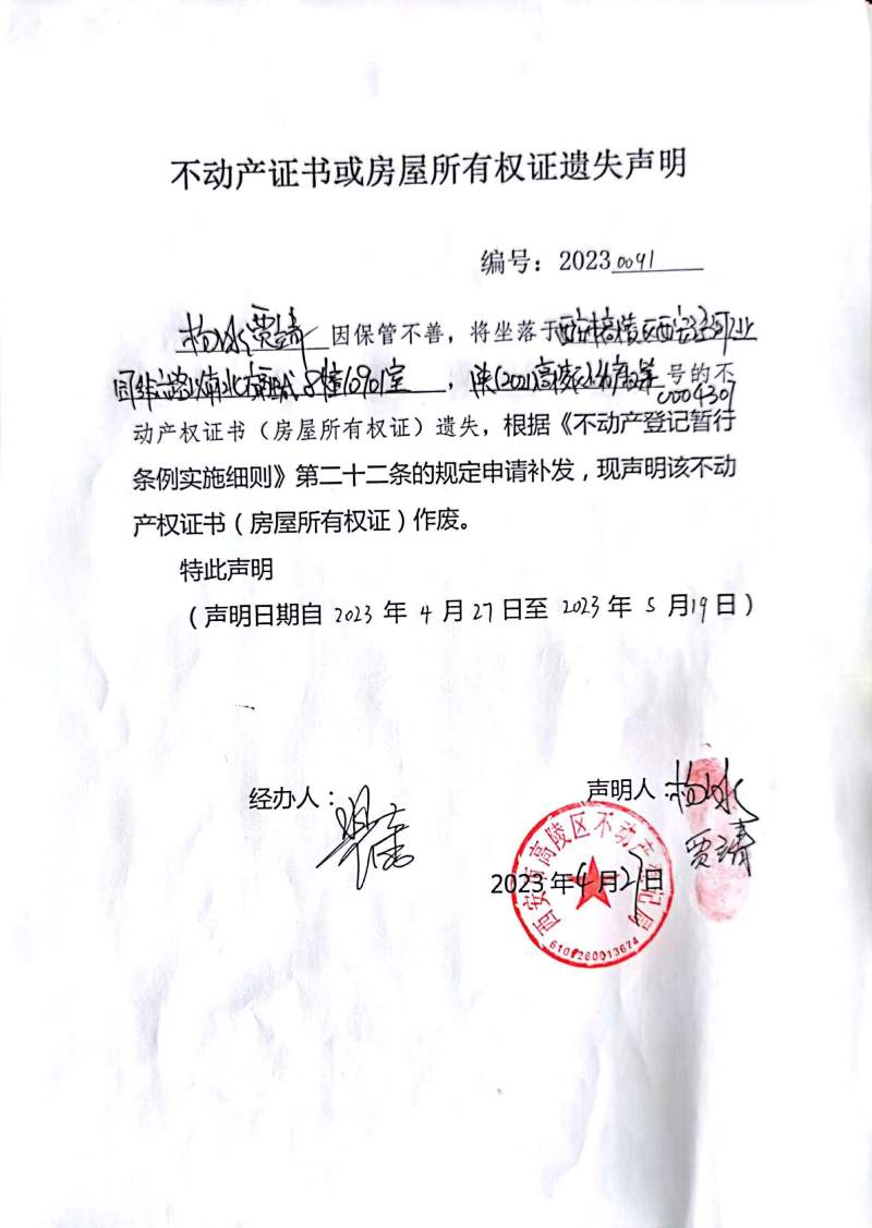 楊冰、賈靖不動(dòng)產(chǎn)證書或房屋所有權(quán)證遺失聲明 編號(hào):20230091