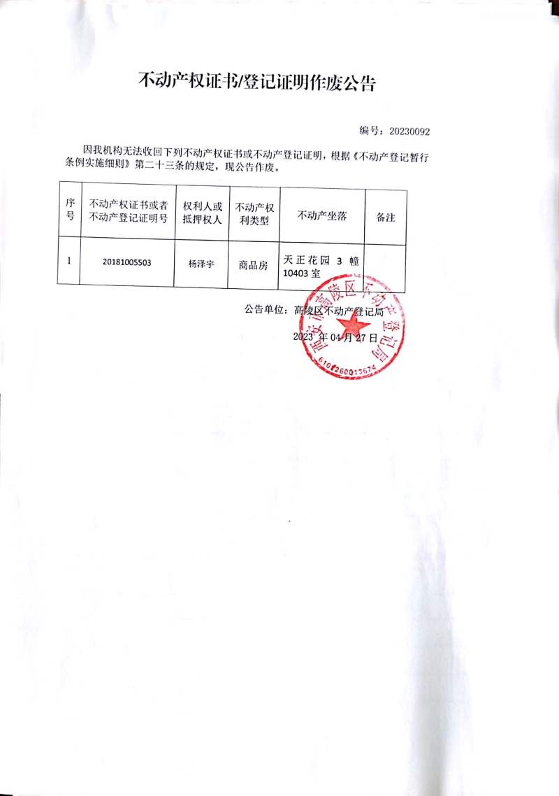 楊澤宇不動產權證書/登記證明作廢公告編號:20230092