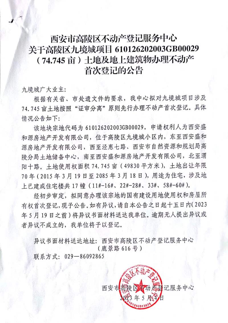 關于九境城74、745畝土地及地上建筑辦理不動產首次登記的公告