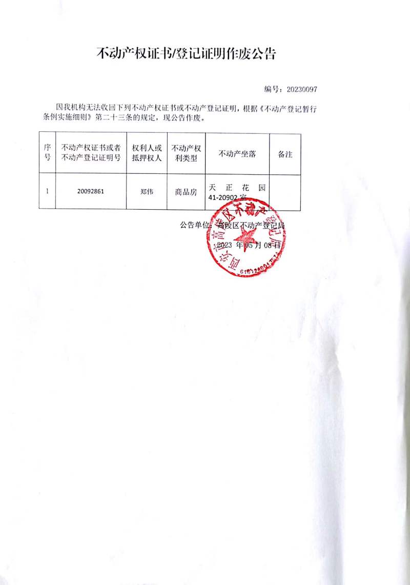 鄭偉不動產權證書/登記證明作廢公告編號:20230097