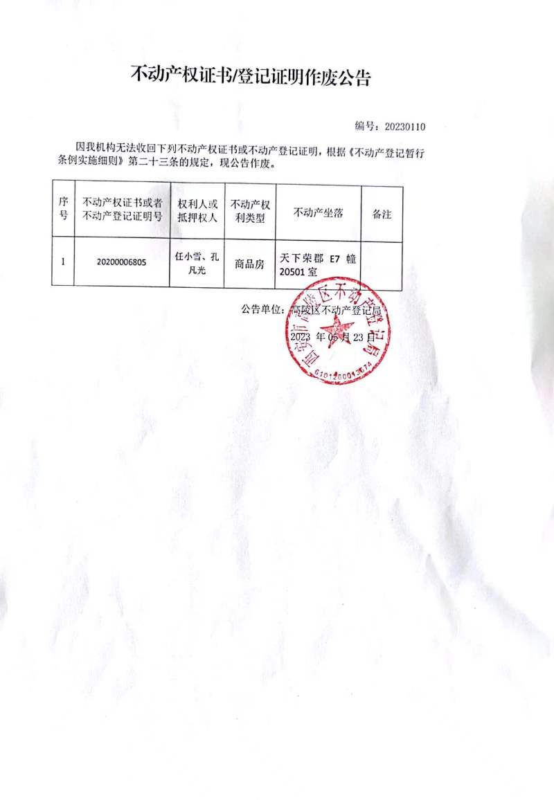任小雪、孔凡光不動產(chǎn)權證書/登記證明作廢公告編號:20230110
