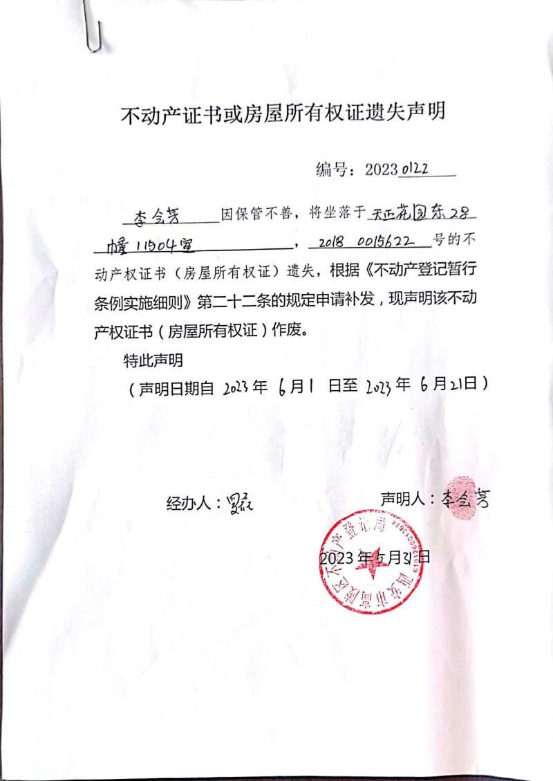 李會芳不動產證書或房屋所有權證遺失聲明 編號:20230122