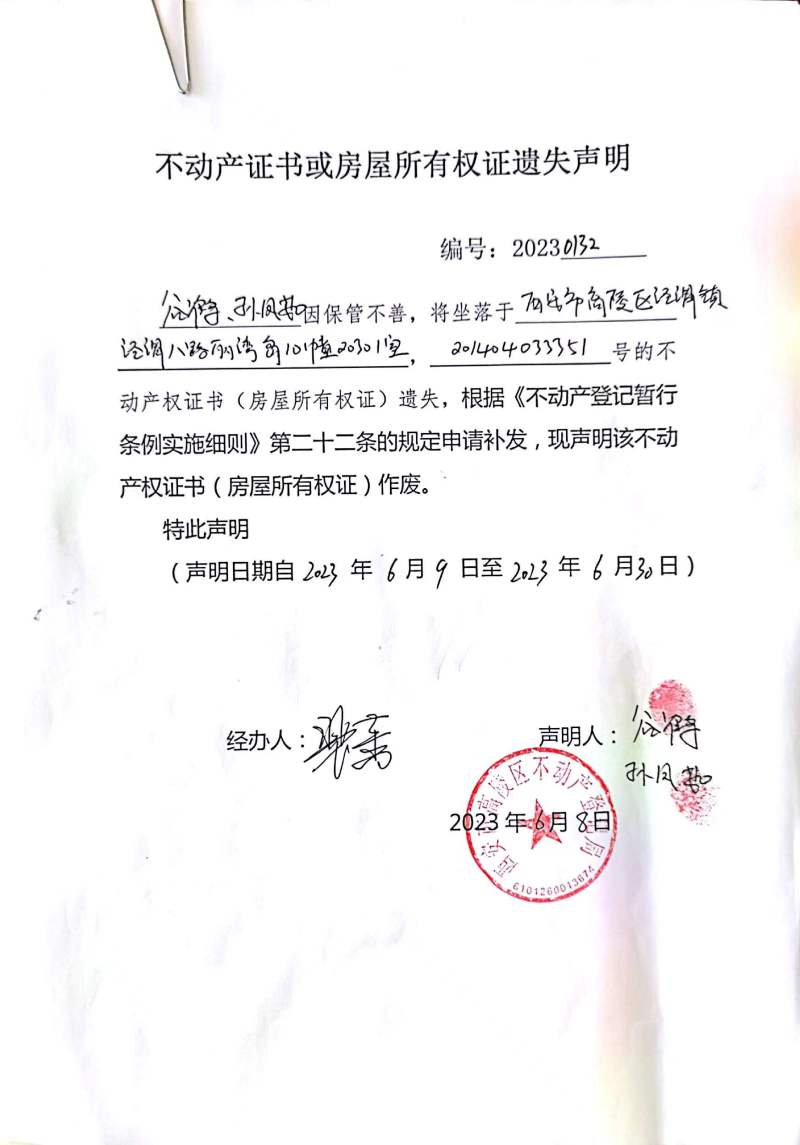 谷鶴、孫鳳茹不動產證書或房屋所有權證遺失聲明 編號:20230132