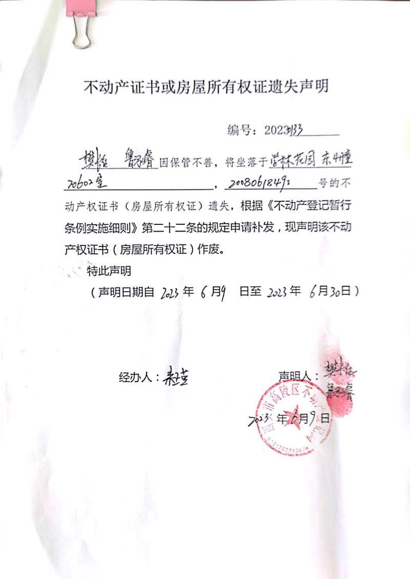 樊長征、魯泓睿不動產證書或房屋所有權證遺失聲明 編號:20230133