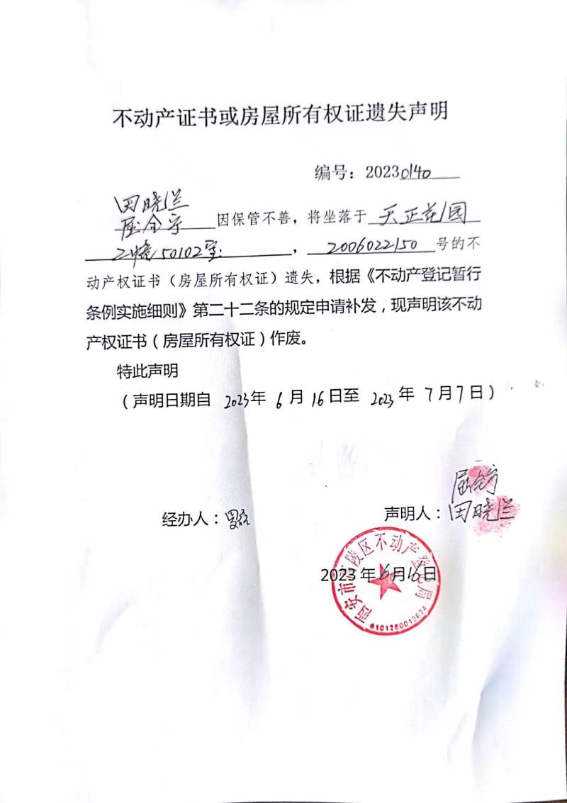 田曉蘭、屈全寧不動(dòng)產(chǎn)證書或房屋所有權(quán)證遺失聲明 編號(hào):20230140