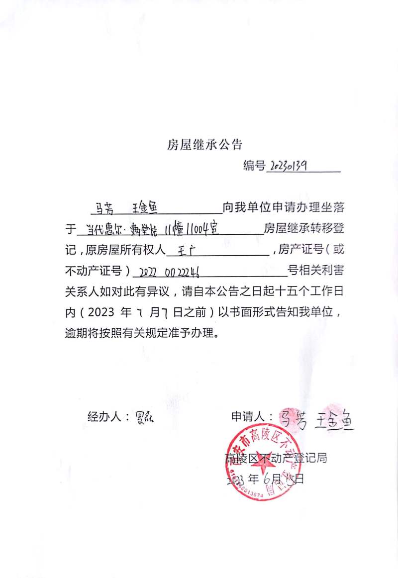 馬芳、王金魚房屋繼承公告 編號(hào):20230139