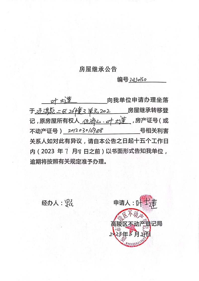 葉士蓮房屋繼承公告 編號:20230150