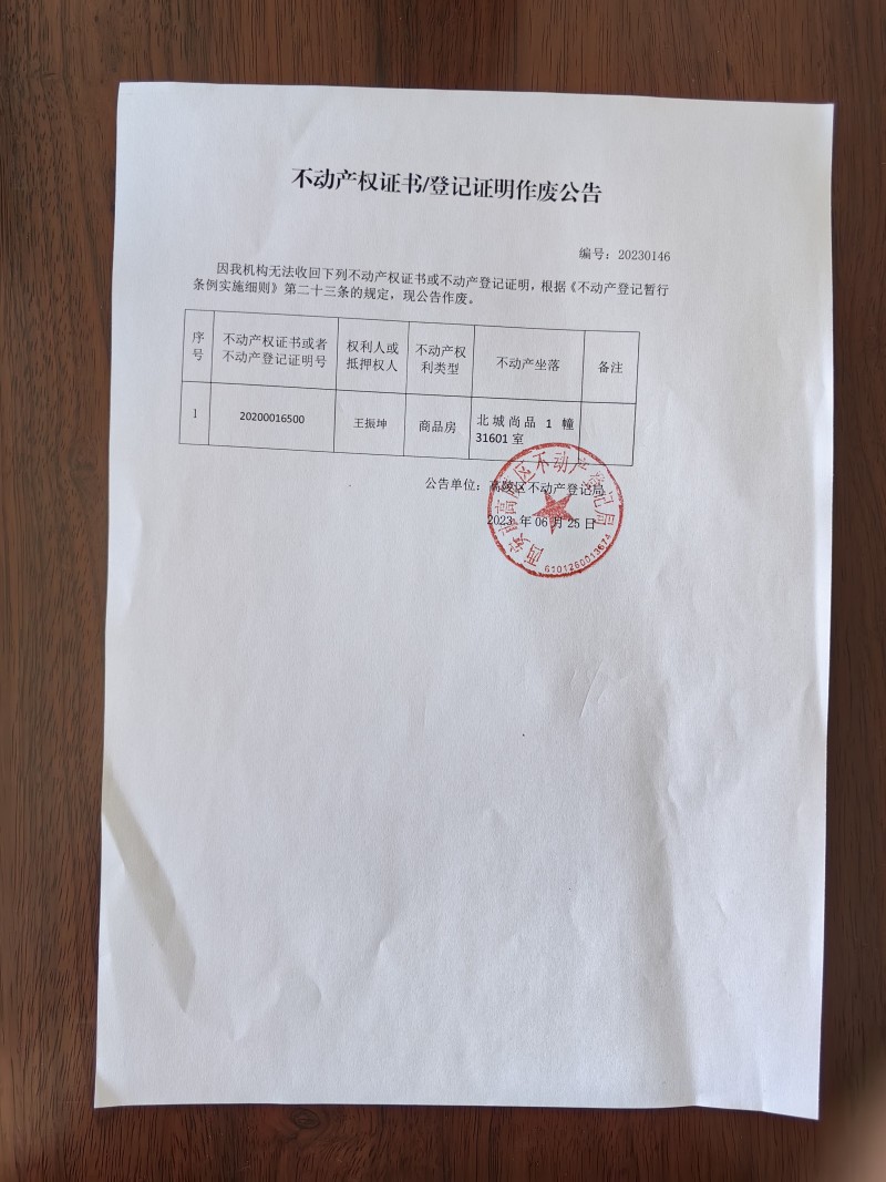 王振坤不動產權證書/登記證明作廢公告編號:20230146
